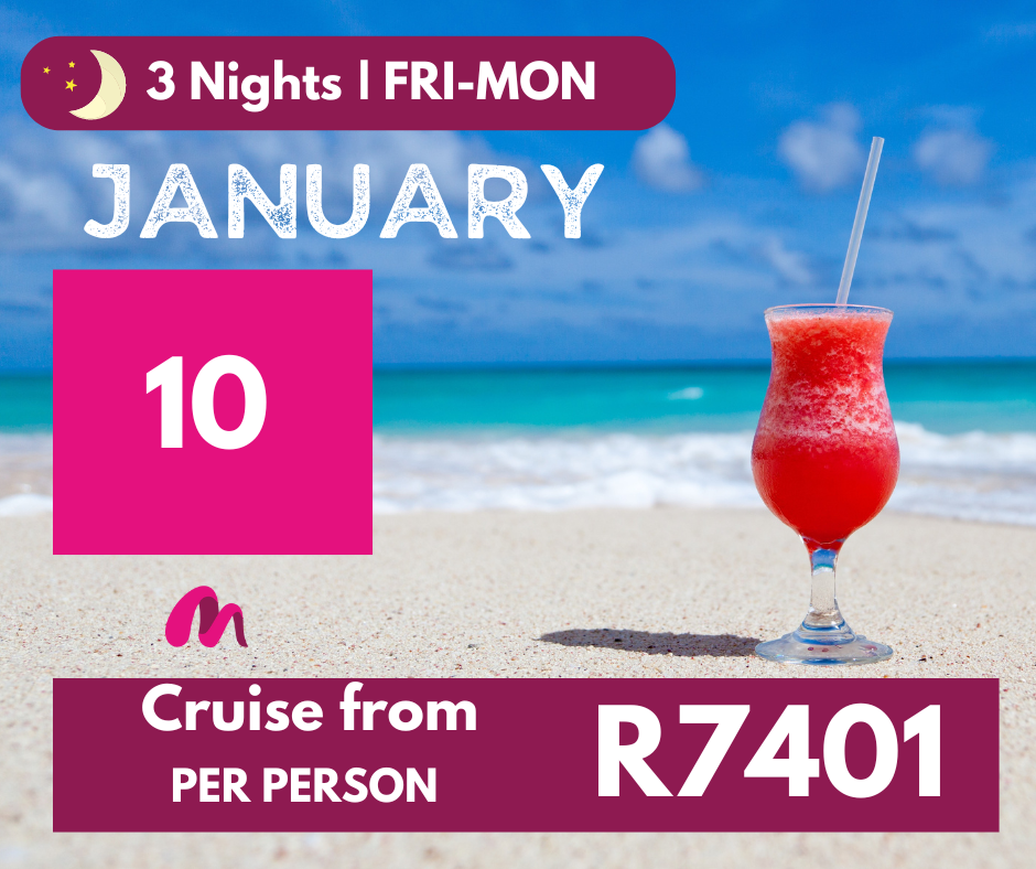 Discover the beauty of the Indian Ocean and South Atlantic Ocean, and explore popular destinations like Pomene, Portuguese Island, Port Louis, La Possession, Marion, Walvis Bay, Cape Town, and Durban. Prices range from R6 401 p.p*, including port and service fees*.